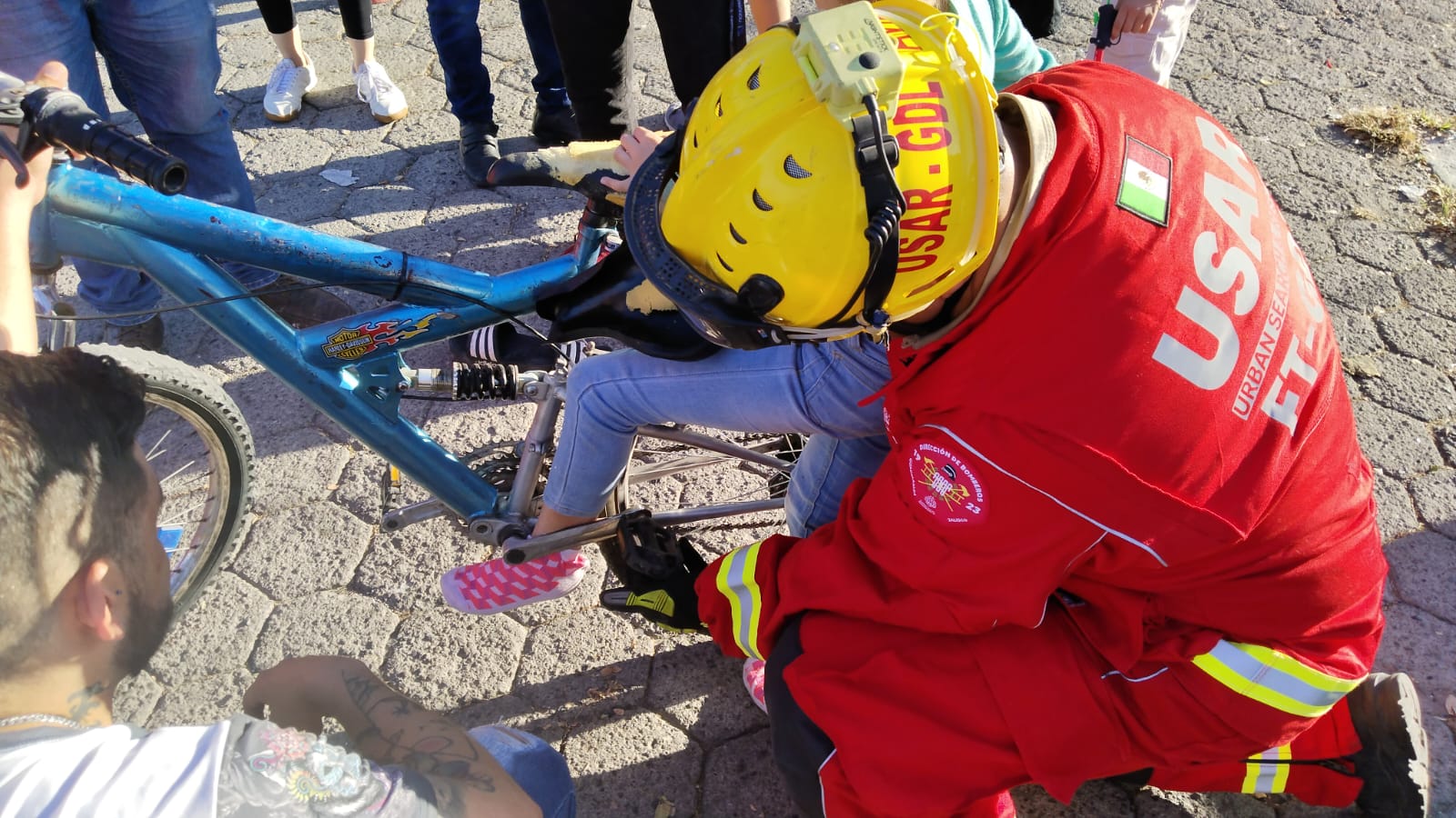 En Río Juárez y Torrecillas en la colonia el Rosario, Bomberos de Guadalajara dieron atención a una menor de 8 años la cual al estar jugando en una bicicleta sufrió un percance ocasionado q una de sus extremidades quedara atrapada entre el pedal y el cuadro de la misma, procedimiento a realizar maniobras con equipo hidráulico para su liberación, se brinda la atención prehospitalaria. Familiares la trasladan al servicios médicos para descartar algúna posible fractura.
